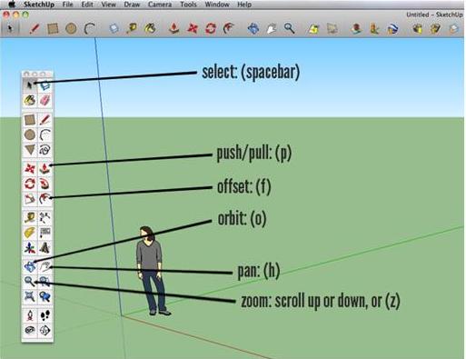 Begin by downloading the free version of Google Sketchup here. When you first open Sketchup, you’ll be prompted with a dialog box asking what style to begin with. I have chosen the simple style, with blue sky and green ‘grass’ (this is completely your preference, it will have no effect on your final outcome). Open the main tool box by clicking View > Tool Palettes > Large Tool Set. There are a few tools we’ll make a lot of use of, so it’s helpful to familiarize yourself with their shortcuts. These are the same on Windows and Mac: select: (spacebar), push/pull: (p), offset: (f), orbit: (o), pan: (h), zoom: scroll up or down, or (z)