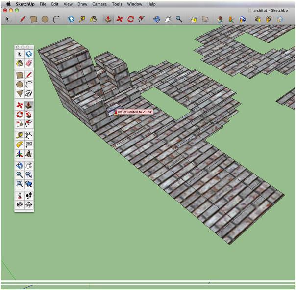 Once you have all of your letters pulled, it’s time to change up a few roofs to add a little visual interest and detail. We’ll do this by using the offset tool (f). Zoom in closely to your first letter, grab your offset tool, and get close to the edge of the roof you would like to adjust. Once on the edge, click and move the offset tool inward, towards the center of the top of the building. You’ll notice new edges, forming what looks like a border. Release the tool by unclicking when you are satisfied by the width.