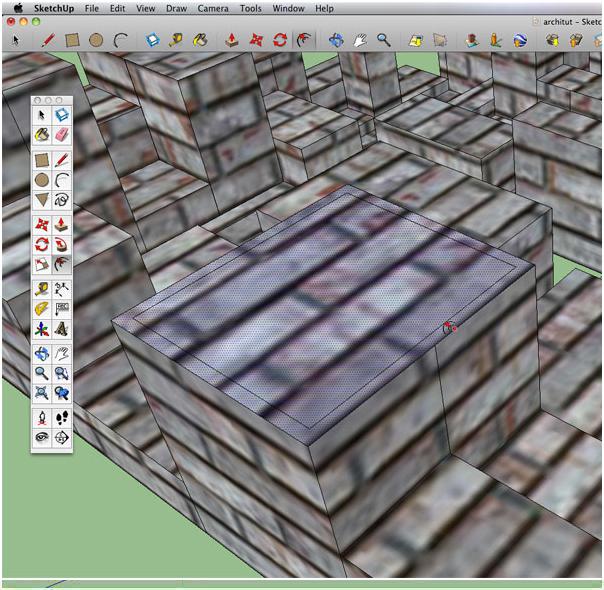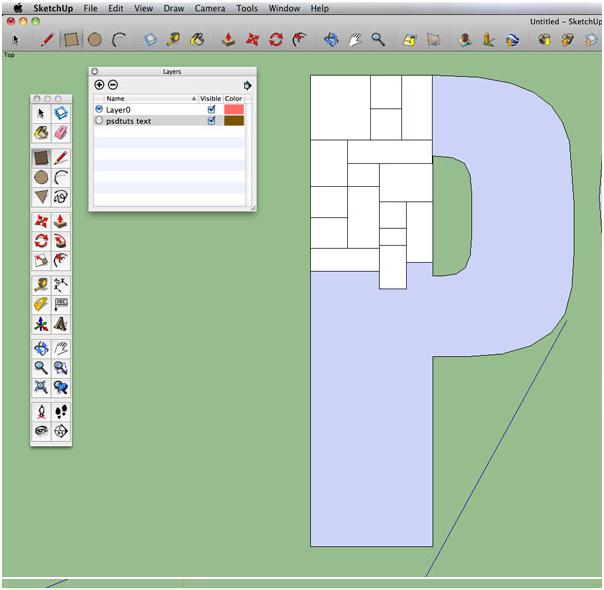 Now, grab your push/pull tool (p) and once the center of the newly formed border is highlighted in blue, push downward to create a rooftop. Repeat these steps to random building tops on all of your letters.