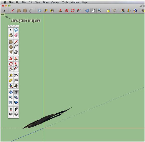 We need to create a template for where we’re putting our buildings. We’ll do this by viewing everything from the top. To view from the top, go to Camera > Standard Views > Top. You should see the word "Top" in the upper left corner after you do this. You’ll want your red and green axes pretty close, so zoom in if necessary to get to a nice position (below). To grab the screen, use the pan tool (h) to help line everything up.