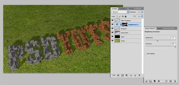 Now to juice up these letters! Cmd/Ctrl-click the Original’s layer thumbnail to select its content. Create a brightness and contrast adjustment layer, setting brightness to -31, and contrast to 100.