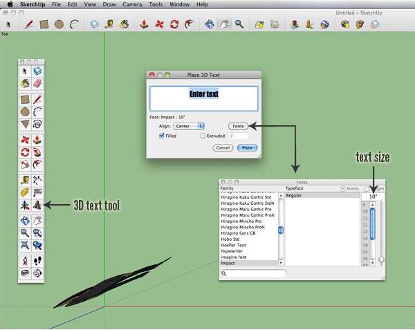 Next, click on the 3D text tool and type in your text. Click on "Fonts" to change your font (thick stroked bolder fonts work best), and input a size of 10" or greater. Then click "Place"