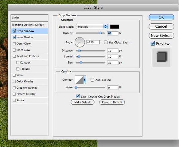Now we need to add a couple of layer styles to the Original layer. Double click the layer, and check Drop Shadow. Add the settings below. I’ve turned off global light and chosen an angle to make the drop shadow match the Original’s shadows, so choose an angle for your own that will best match up with yours.